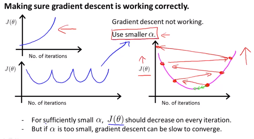 - if $\alpha$ is too large: $J(\theta)$ may not decrease on every iteration; may not converge.