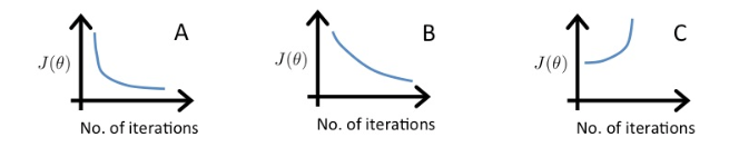 Quiz: Suppose a friend ran gradient descent three times, with α=0.01, α=0.1, and α=1, and got the following three plots (labeled A, B, and C):