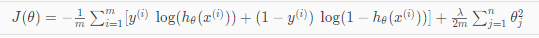 $J(\theta) = - \frac{1}{m} [\sum_{i=1}^m y^{(i)} log h_{\theta} (x^{(i)}) + (1-y^{(i)}) log(1-h_{\theta} (x^{(i)}))] + \frac{\lambda}{2m} \sum_{j=1}^n \theta_j^2$